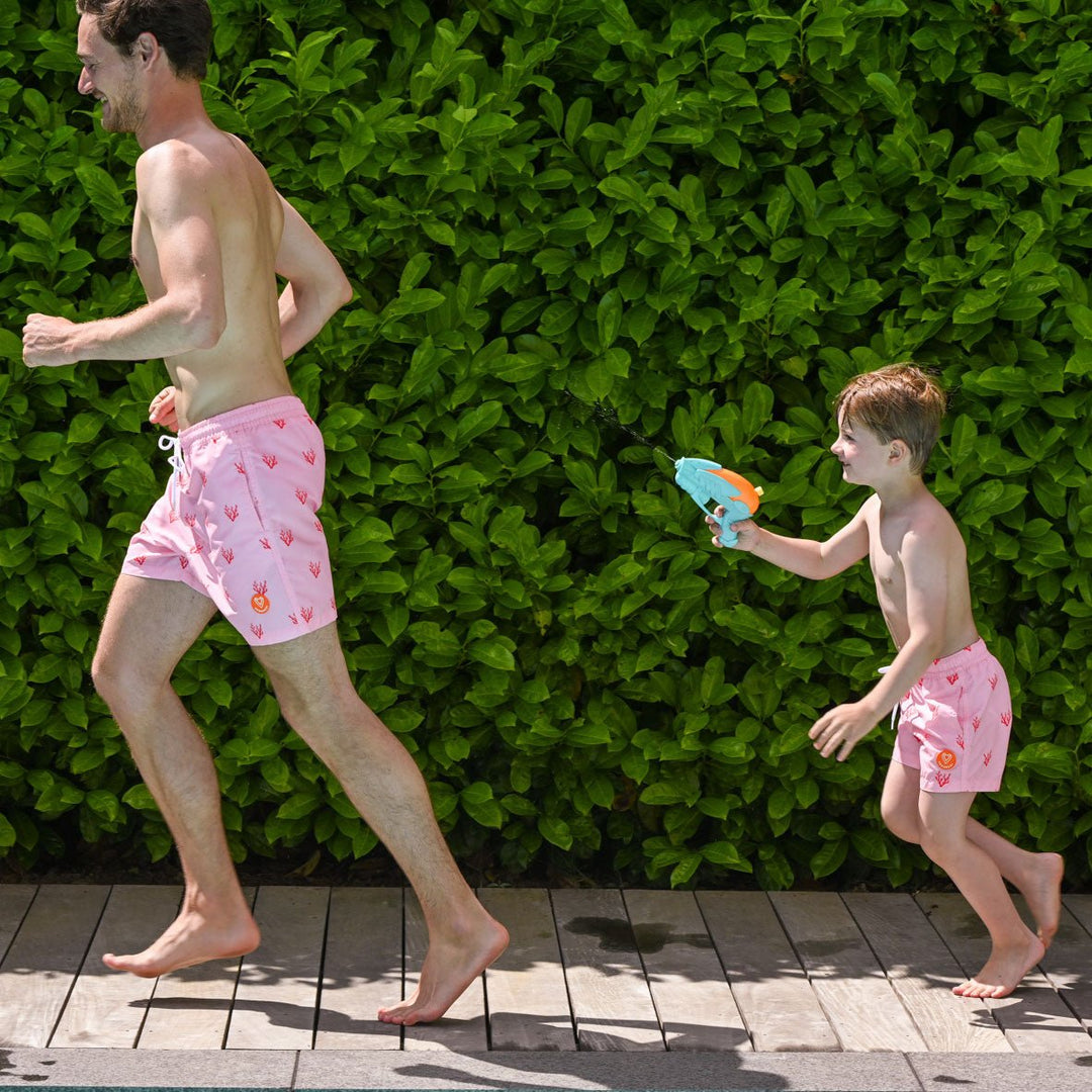 Les motifs joyeux et les coloris acidulés estivaux s’associeront à merveille au short de bain de papa, mais également à un duo frère/sœur.
