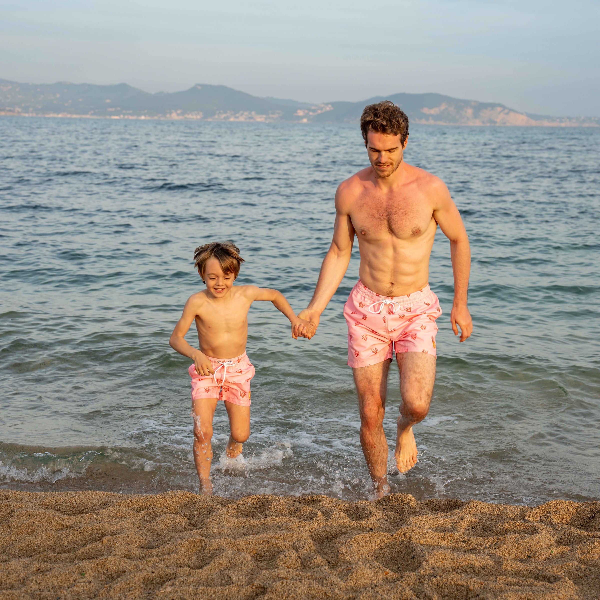 Les motifs joyeux et les coloris acidulés estivaux s’associeront à merveille au short de bain de papa, mais également à un duo frère/sœur.